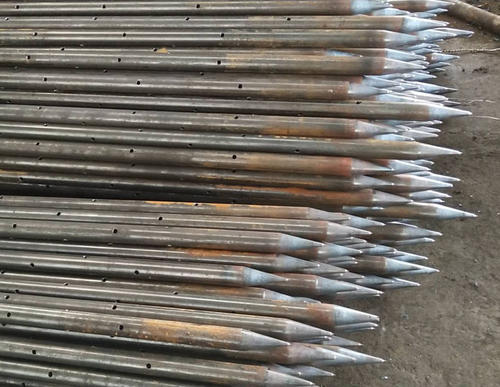 (2)小导管的材质和直径应符合设计要求。应采用直径为42mm的无缝钢管。前端应做成锥形,后端应焊接钢箍筋。管体上应设置梅花溢流孔。